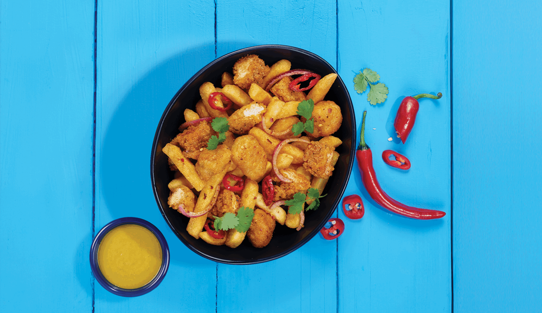 The meal features chicken strips and chicken breast bites, tossed in a salt & chilli Chinese-style spice mix, with red onion, sliced chillies and coriander.