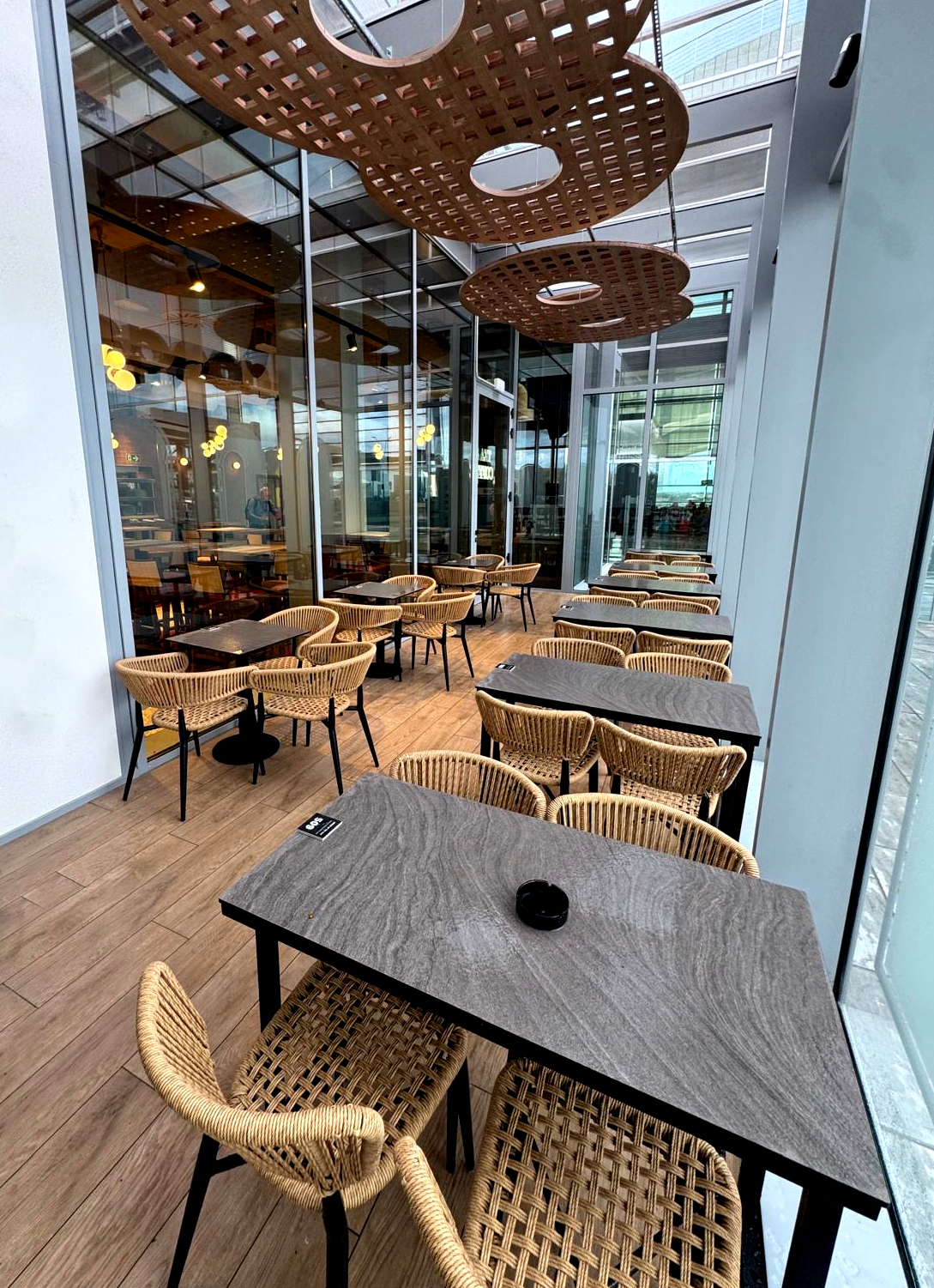 Featuring an external terrace with seating it is located in the departures area (after security).