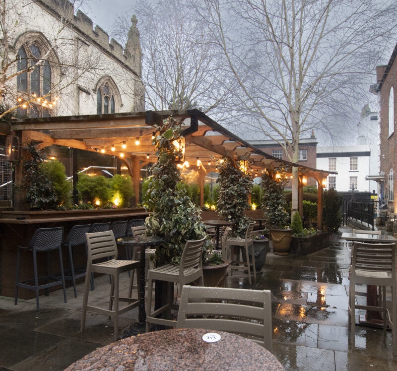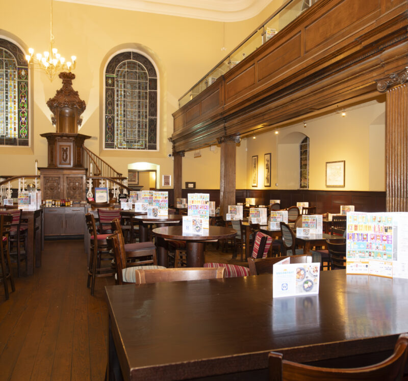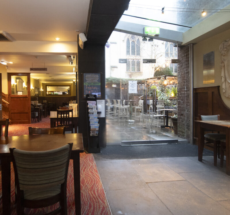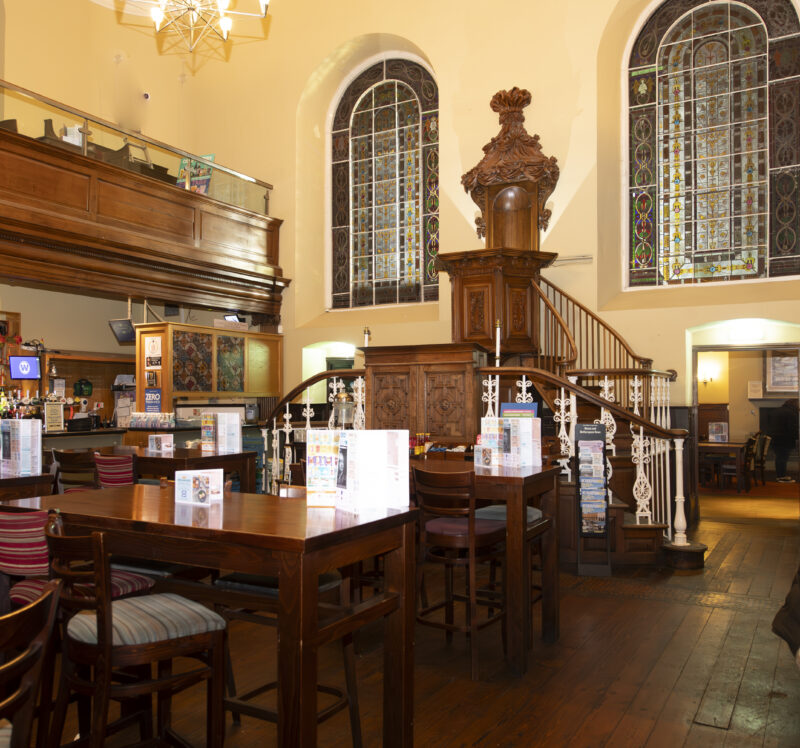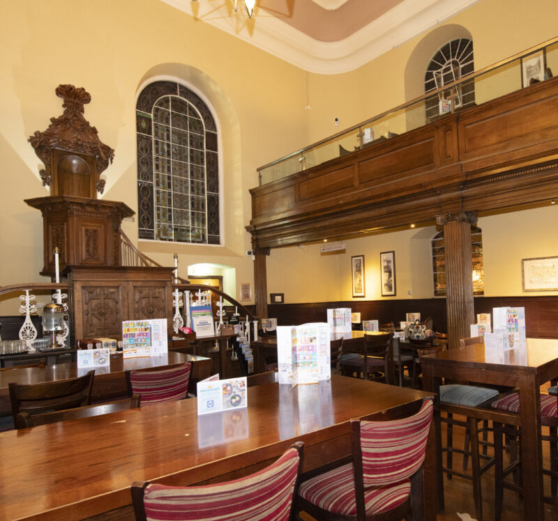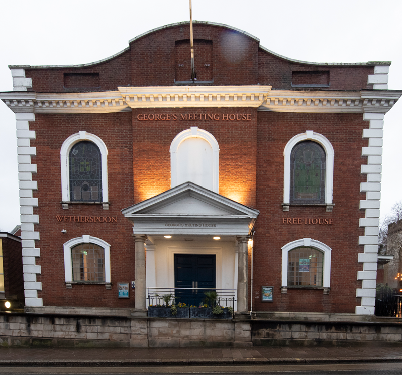 This pub is the former George’s Meeting and is ‘listed’ as having special interest as an unaltered 18th-century chapel. It was built as a Unitarian chapel in 1760 and named after King George III, who came to the throne the same year. George’s Meeting closed as a chapel in 1983 and had been converted to commercial use (Global Village) by 1987. It was most recently an antiques centre.