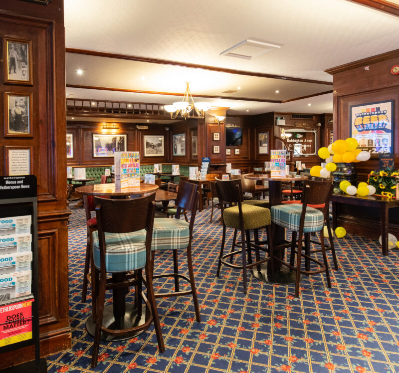 This pub’s site was once part of the gardens immediately behind the long-demolished Babington House. This 17th-century mansion was the home of the Babington family, whose coat of arms depicted two baboons on a large beer or wine cask.
