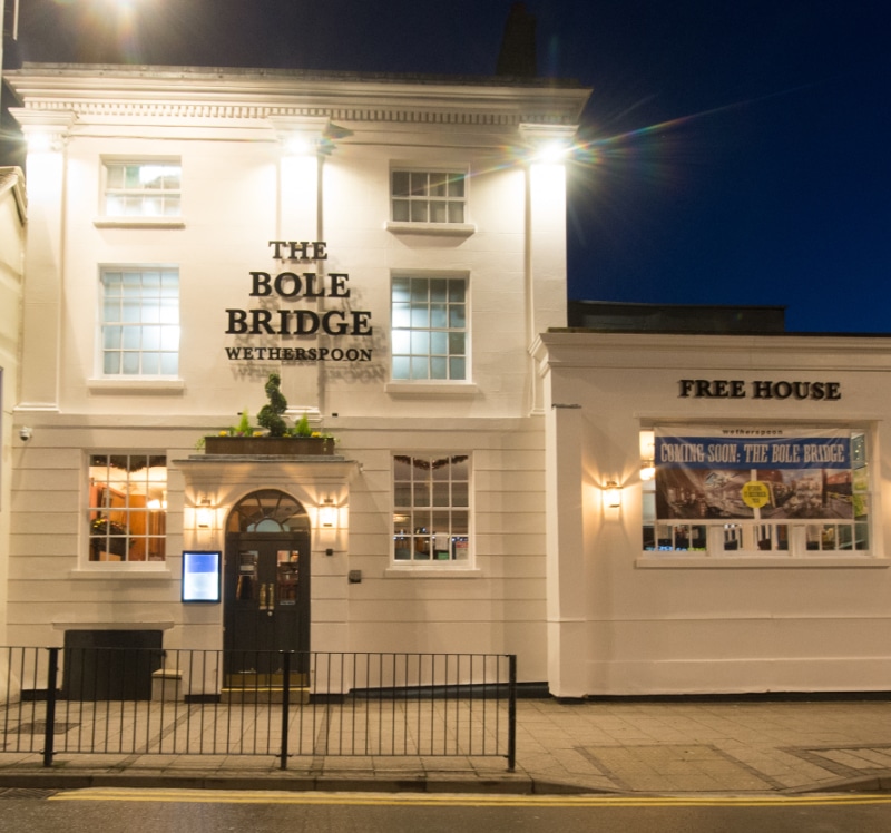 This pub takes its name from the pack-horse bridge which stood at the end of Bolebridge Street until 1877. The bridge was named after the bolles, or measures of grain, carried across the river.