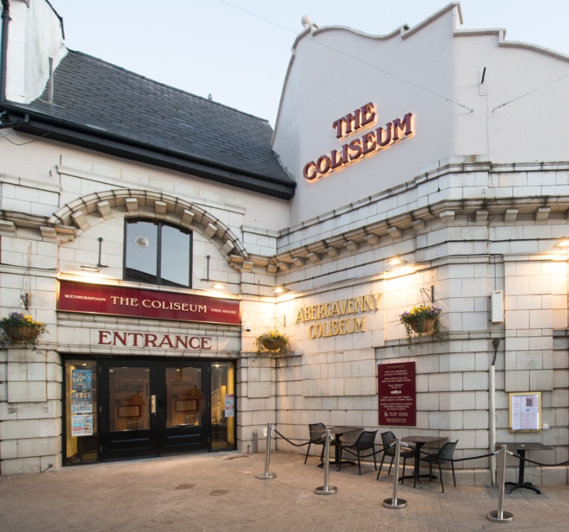 This is the former Coliseum cinema which opened in 1913 and screened its last film in the 1990s. In 1913, the Abergavenny Coliseum Company acquired land in Lion Street – and The Coliseum opened on 3 November 1913. In mid 1989, the cinema’s stalls were converted to shops, with a cinema above. By 1998, The Coliseum had become a bingo hall, with various shop units, and is now this Wetherspoon pub.