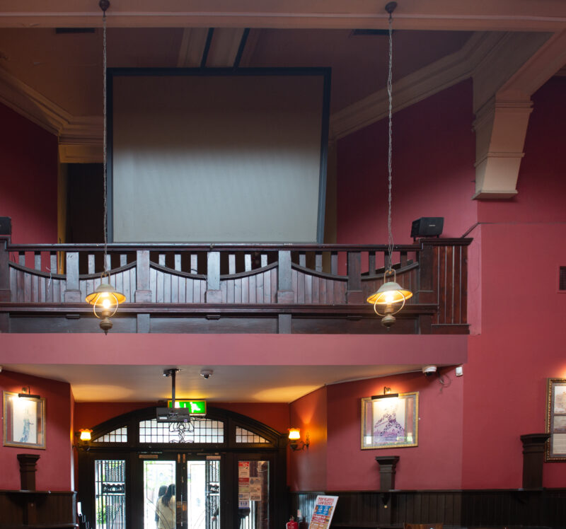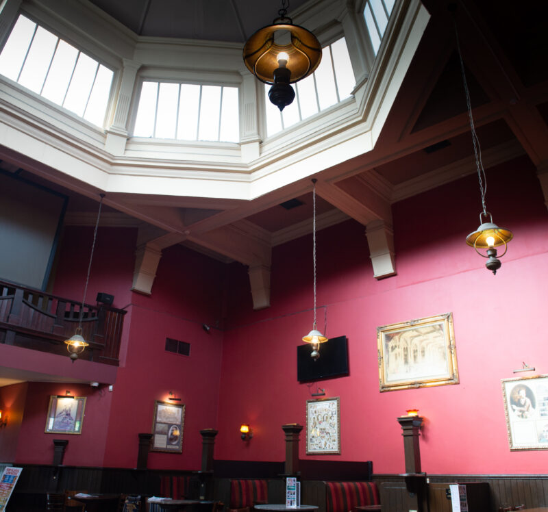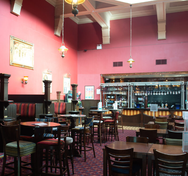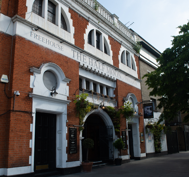 The former Methodist chapel, forming the front of these premises, was built in 1900. In 1977, the disused chapel, with its high octagonal ceiling, was taken over by the Half Moon Theatre Company, opening with a production of Robert Tressell’s The Ragged-Trousered Philanthropists. In 1985, the theatre expanded into a derelict site next door, yet closed in 1990. Several years later, it was converted into The Half Moon.