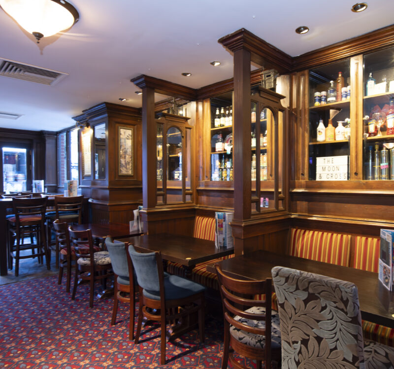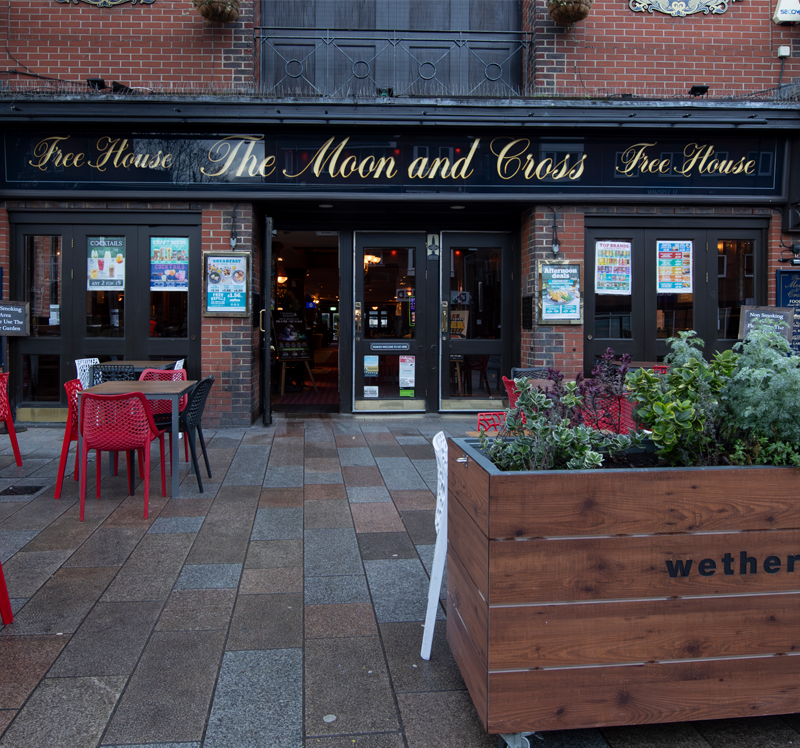 The ‘moon’ part of this Wetherspoon free house’s name links it with the ideal pub described by George Orwell. The famous writer called his fictitious pub ‘Moon Under Water’. The ‘cross’ refers to the nearby monument, erected in 1290 by King Edward I in honour of his queen – Eleanor of Castille. It is one of 12 crosses which mark the overnight stopping places of the queen’s funeral cortège, on its way to Westminster Abbey.