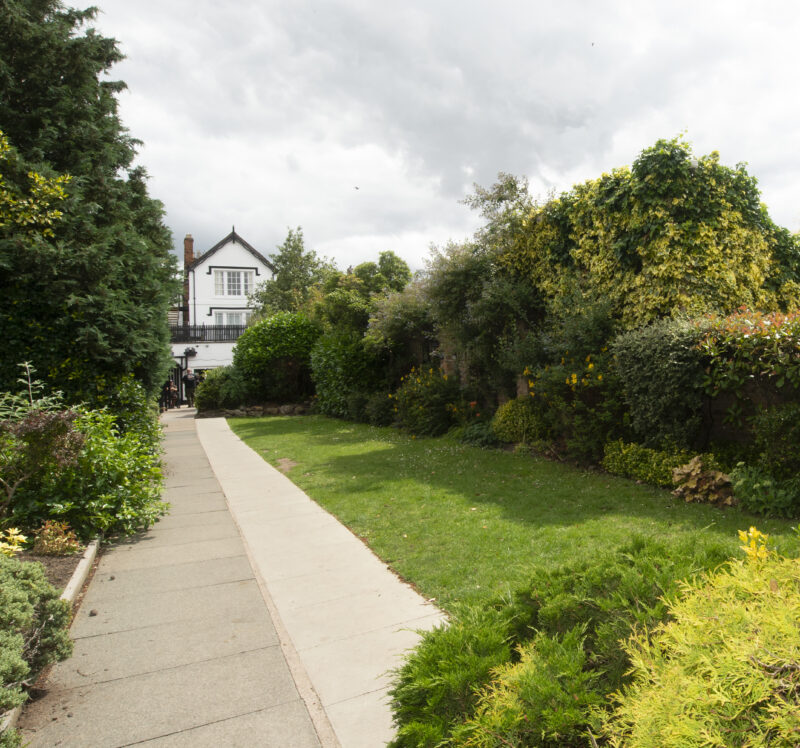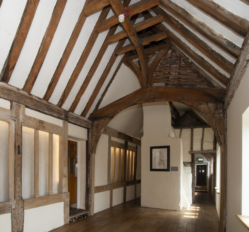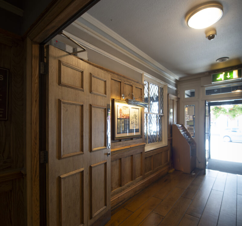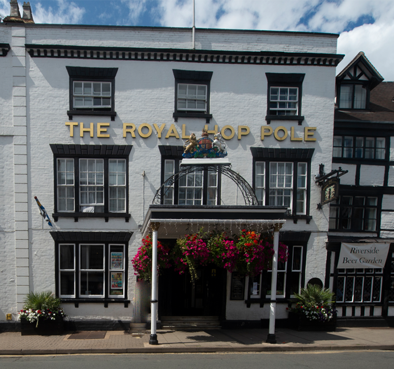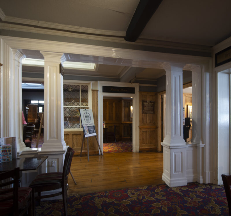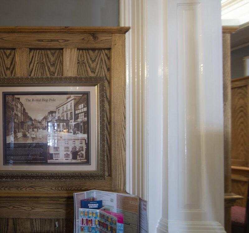 Seen from the front, the building is in three parts: the central section has an ornate portico, dating from 1921, having replaced a wide gateway leading to the yard and stables at the rear. Above the portico is the royal coat of arms of Princess Mary of Teck, later Queen Mary, royal consort to George V. The hotel was given permission to display the royal arms after the princess’s 1891 visit, since when it has been called The Royal Hop Pole.