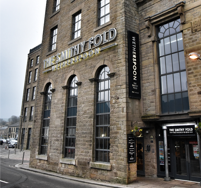 The bridge which gave Bridge End Mill its name was replaced in 1837 by the new Victoria Bridge (adjacent to this pub). After the new bridge was built, the main road no longer passed along Smithy Fold, but continued up Victoria Street. Smithy Fold is now a short passage, leading from the Howard Town Mill car park to High Street.