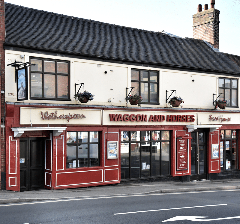 A café bar in the late 1990s, this building had been The Waggon and Horses since 1818. Its original name was restored by Wetherspoon. Alfreton’s two main coaching inns – the George and the Angel – were also in Market Place, but are no longer public houses. The now-demolished Royal Oak was another near neighbour, of old, along with The Four Horse Shoes.