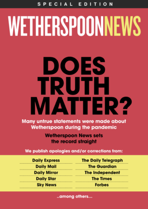 Wetherspoon News magazine Spring/summer 2026 View issue View Spring/summer 2026 magazine Winter/spring 2025/26 View issue View Winter/spring 2025/26 magazine Summer/autumn 2025 View issue View Summer/autumn 2025 magazine Spring/summer 2025 View issue View Spring/summer 2025 magazine Winter/spring 2024/5 View issue View Winter/spring 2024/5 magazine Does truth matter? View issue View Does truth matter? magazine Load more